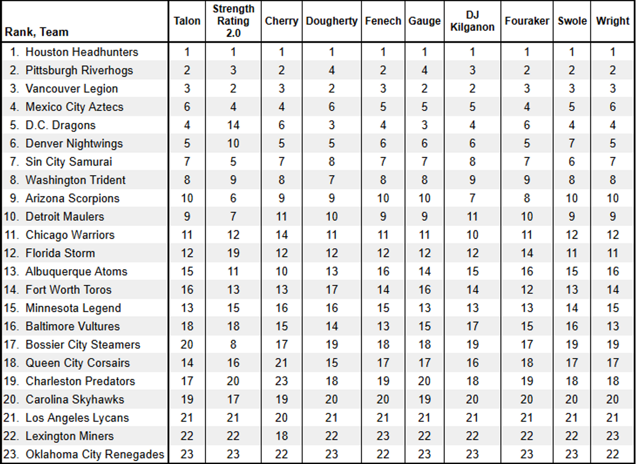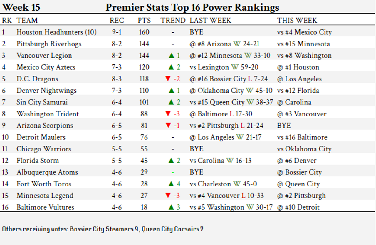 D.C. stumbles in the trap game. Pittsburgh capitalizes against Arizona. Carolina’s late division surge falls short. The playoff roster looks solidified but seeds and byes are still to be fought over. Chicago Warriors. In what is usually the final week of the regular season is now the penultimate week and the drama is just as high. Pittsburgh has two chance to put a stamp on the North crown, Florida is on the cusp of the East, Houston has a shootout ahead for their first South title and Vancouver has only holders Washington to usurp the Western division. Let’s get it started.