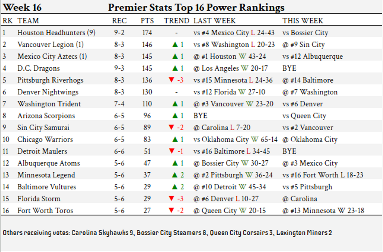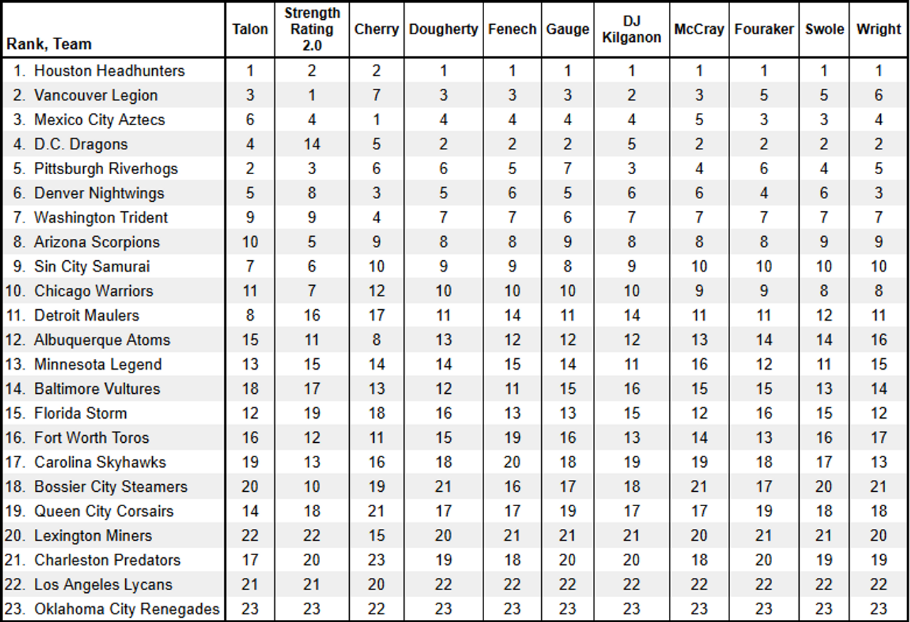 Houston losing the unanimous vote going into the final week is ominous. The top 4 placement is not secure just yet and Bossier City is playing good enough ball to play mega spoiler and kick Houston into a wildcard berth potentially. Vancouver is in the best position off a quick eye test to take over the top spot if Houston does slip which if that’s the case don’t let me say the math didn’t warn ya.