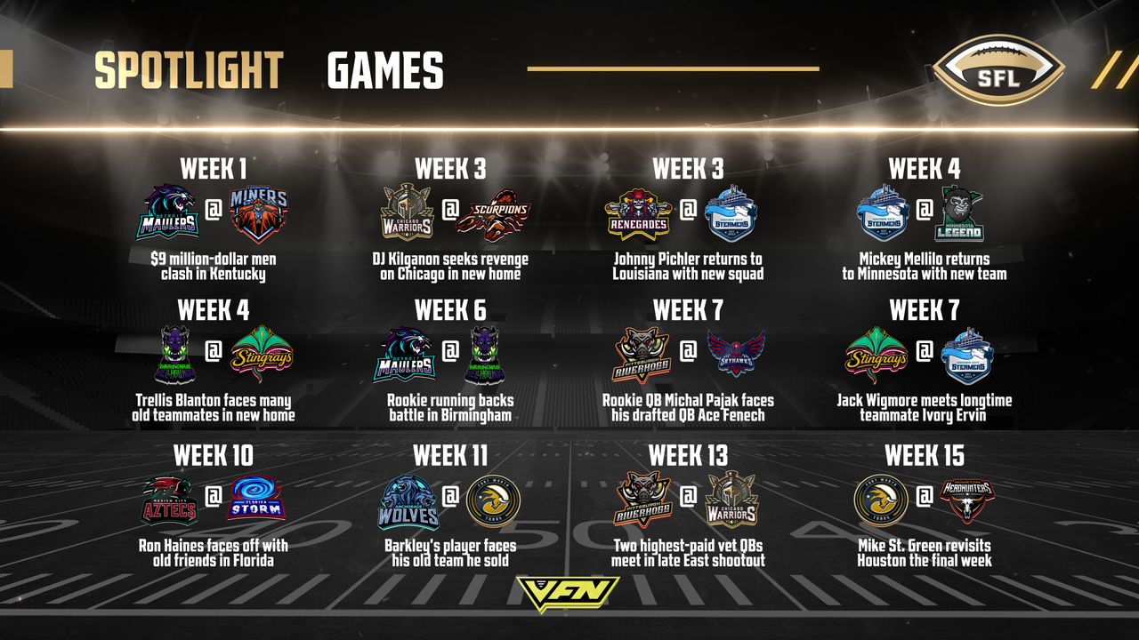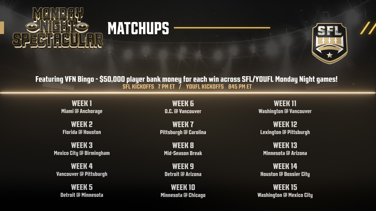 The Virtual Football Network Monday Night Spectacular will feature both the SFL and YOUFL products back-to-back once the YOUFL season gets underway in late February, with the opportunity for SFL players to win money for their player bank by participating in VFN Bingo, which was first played in the SFL at the 2025 Convention in Baltimore. Each bingo nets $50,000 for winning players. Both broadcasts will produce winnings for all players in both leagues, regardless of whether it is SFL or YOUFL competition.